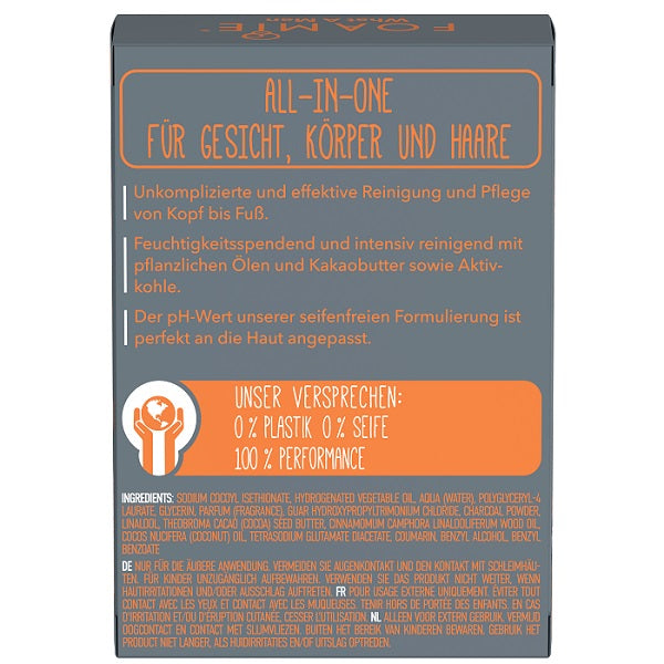Die Foamie Feste Duschpflege für Männer mit Aktivkohle, Rosenholz und Tonkabohne für eine effektive Reinigung. Für Körper, Gesicht und Haar. Im Vergleich zur Foamie Duschpflege für Frauen enthält die neue Variante für Männer mit 90g sogar 10g mehr.