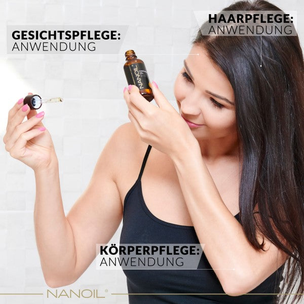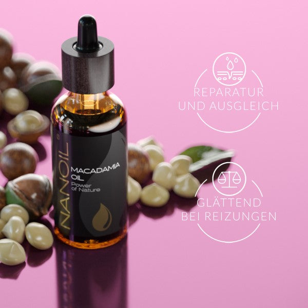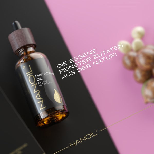 Das Macadamia Oil von NANOIL setzt auf natürliches Bio-Macadamiaöl, kaltgepresst und nicht raffiniert, das nicht nur das Haar, sondern auch die Haut zu verwöhnen weiß. Die luxuriöse Formel verfügt über reparierende und antioxidative Eigenschaften und punktet mit einem Anti-Aging-Effekt – ideal also für die reife Haut, aber auch geschwächtes Haar. Sichtbare Zeichen von Hautalterung bekämpft das Macadamia Oil, das reich ist an essenziellen Fettsäuren und den Vitaminen A, B und E, genauso wie Pigmentflecken, als Haarspülung wirkt es feuchtigkeitsspendend und stärkend, verleiht Glanz und Geschmeidigkeit.