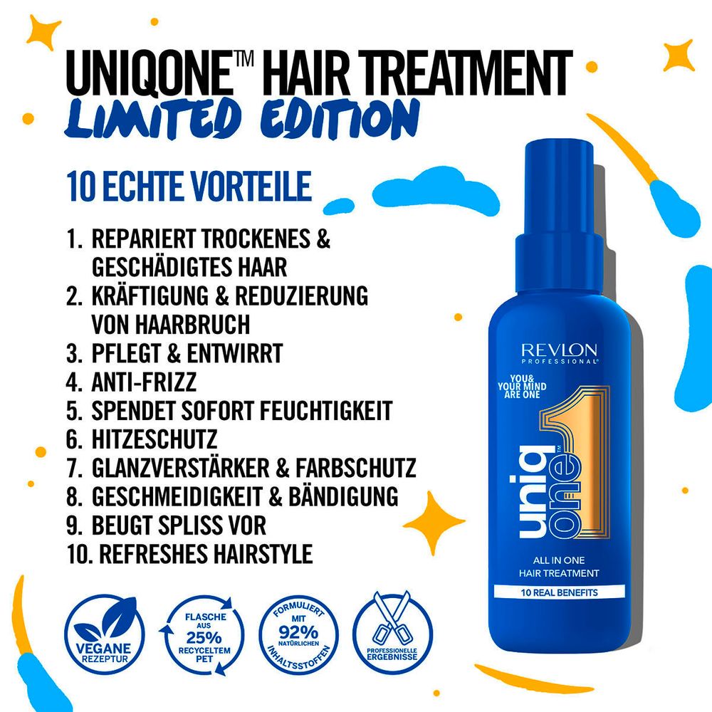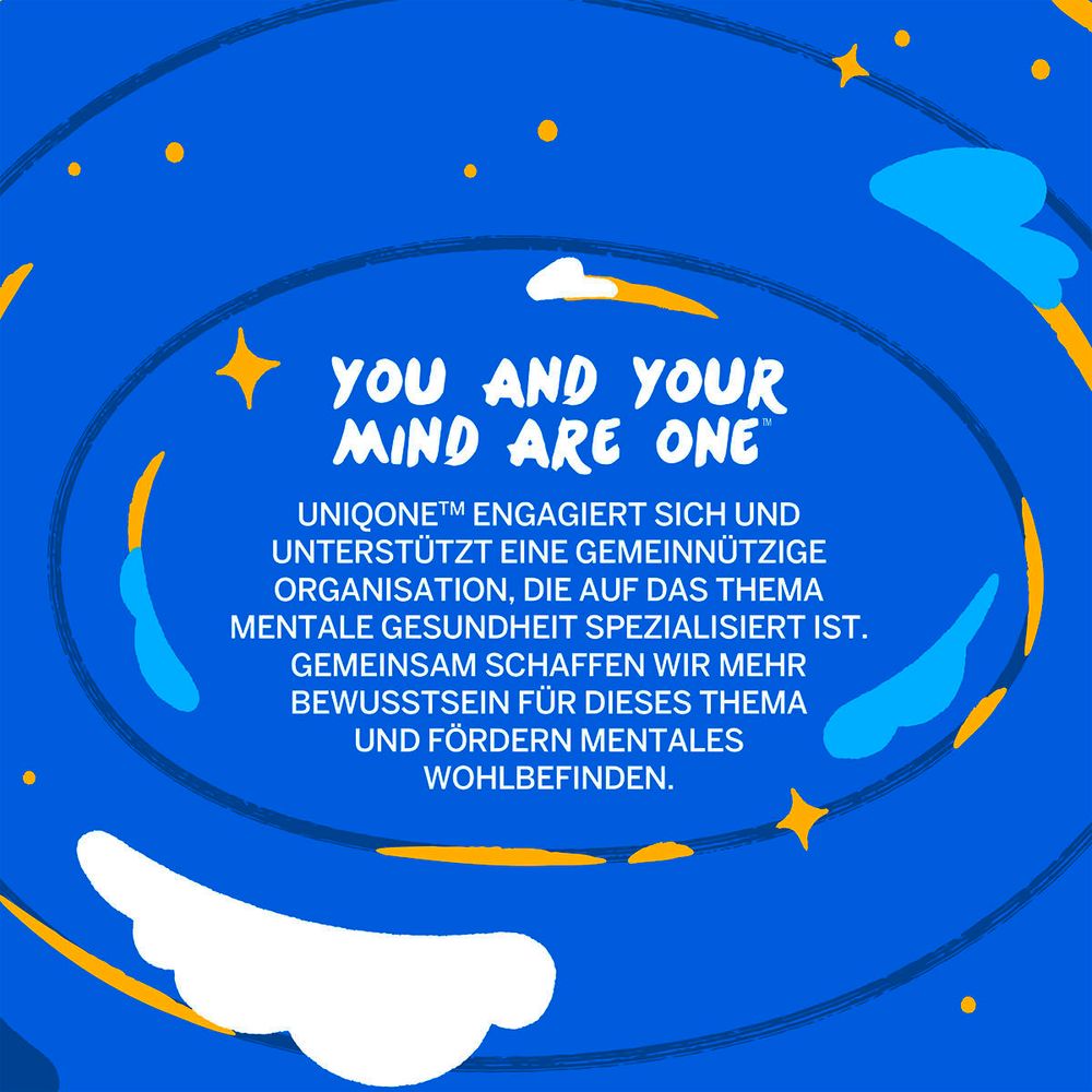 Unser hektischer Lebensstil lässt uns heute oft keine Zeit mehr für uns selbst. Zeitmangel ist eine Hauptursache für Stress. Wir fühlen uns überfordert und verlieren den Kontakt zu uns selbst und zu anderen. Uniqone hat es sich zur Aufgabe gemacht, das Bewusstsein für das mentale Wohlbefinden zu steigern. You and your mind are one. Mit der neuen Limited Edition der UniqOne-Haarkur, die unsere unermüdliche Unterstützung für mentales Wohlbefinden symbolisiert, nutzen wir die Kraft der Farbe Blau.