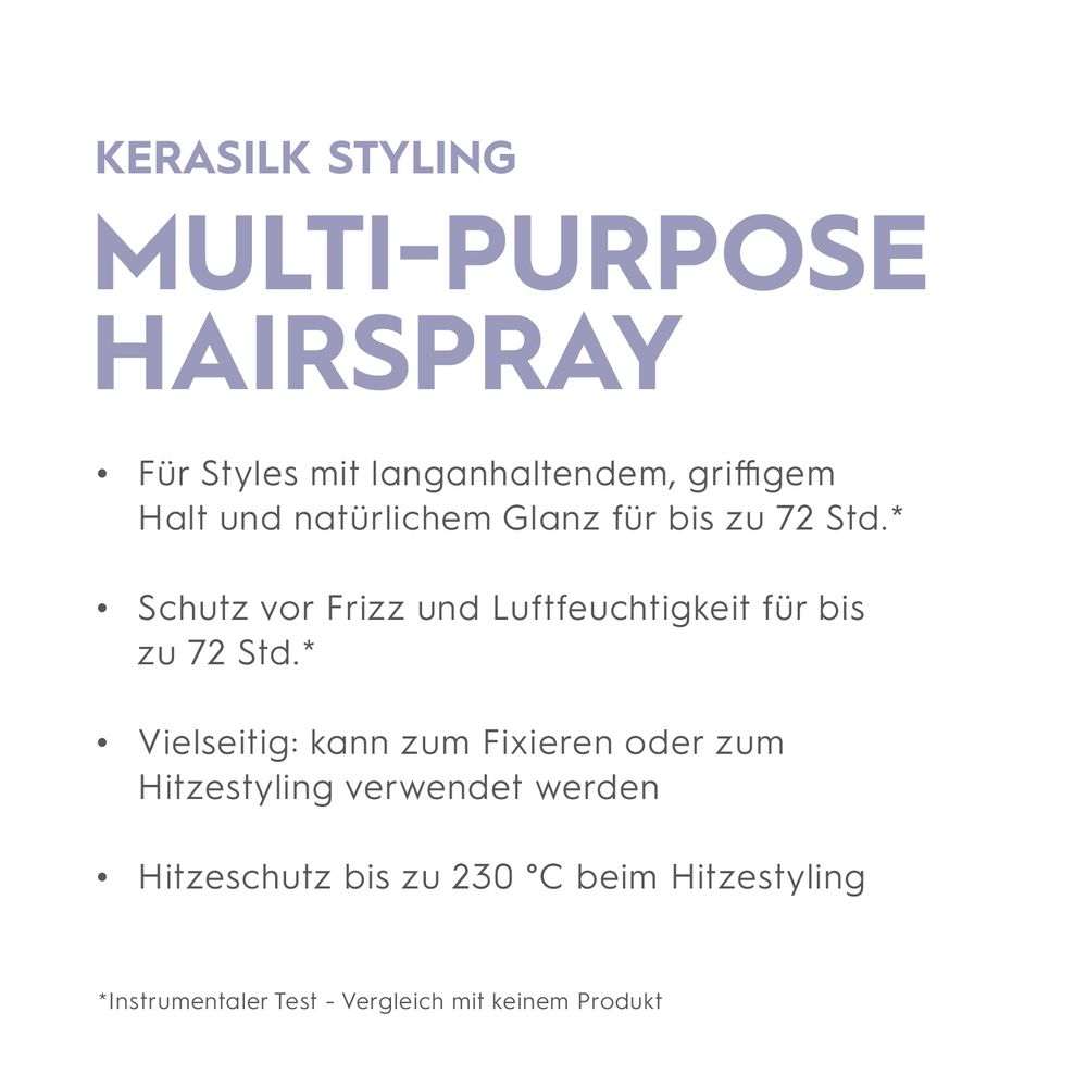 The Kerasilk Multi-Purpose Hairspray is a versatile hairspray with Biomimetic Silk and Blue Lotus Extract. The 100% vegan formula can be used for setting or heat styling - for styles with long-lasting, grippy hold and shine for up to 72 hours.