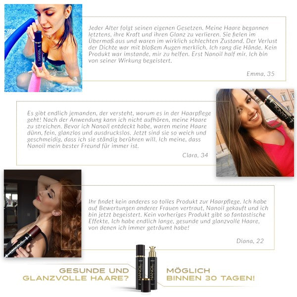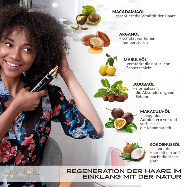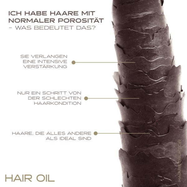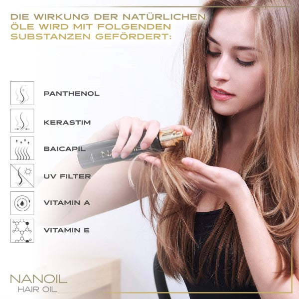 The Medium Porosity Hair Oil is the perfect treatment for anyone who struggles with split ends and annoying frizz and whose hair tends to become statically charged. NANOIL's luxurious formula is full of nutrients and supports the hair's natural repair processes: with six precious oils - macadamia oil, argan oil, marula oil, jojoba oil, passion fruit oil and coconut oil - refined with kerastim and baicapil, a UV filter, vitamins A and E and silk. This unique mixture gives the hair a brilliant shine, protects it from harmful environmental influences, counteracts hair breakage and split ends and makes the hair more resilient and fresh.