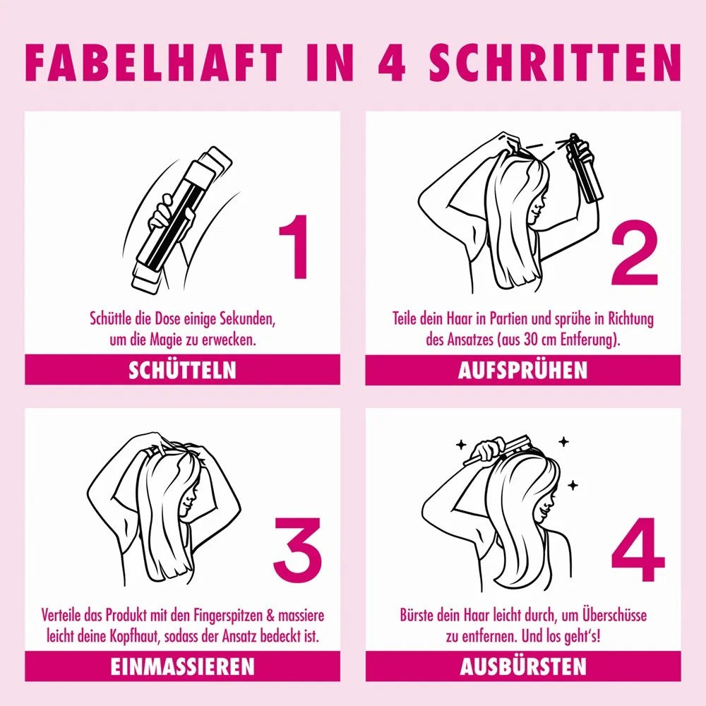 Dose vor Gebrauch gut schütteln. Aus ca. 20–30 cm Entfernung auf den Haaransatz sprühen. Kurz einwirken lassen, anschließend mit den Fingerspitzen einmassieren und gründlich ausbürsten. Danach wie gewohnt stylen.