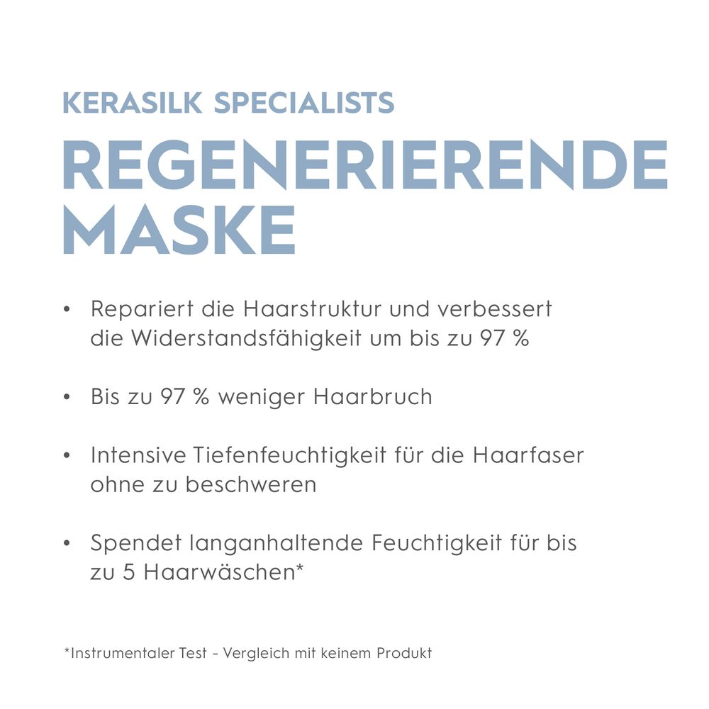 Le Masque Régénérant Kerasilk est un masque de régénération intensive en profondeur, au SIlk Biomimétique et au Hyaloveil. La formulation 100 % végétalienne répare efficacement les structures capillaires sèches et abîmées et fournit une hydratation intensive – pour jusqu'à 97 % de résistance en plus.